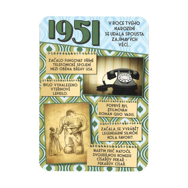 Retro pohlednice obsahující zajímavosti z roku 1951.