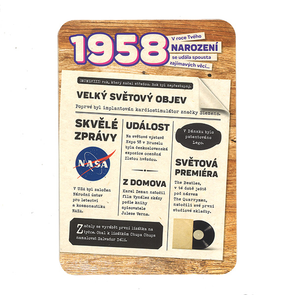 Retro pohlednice obsahující zajímavé informace, události a osobnosti narozené v roce 1958 z Československa a celého světa.